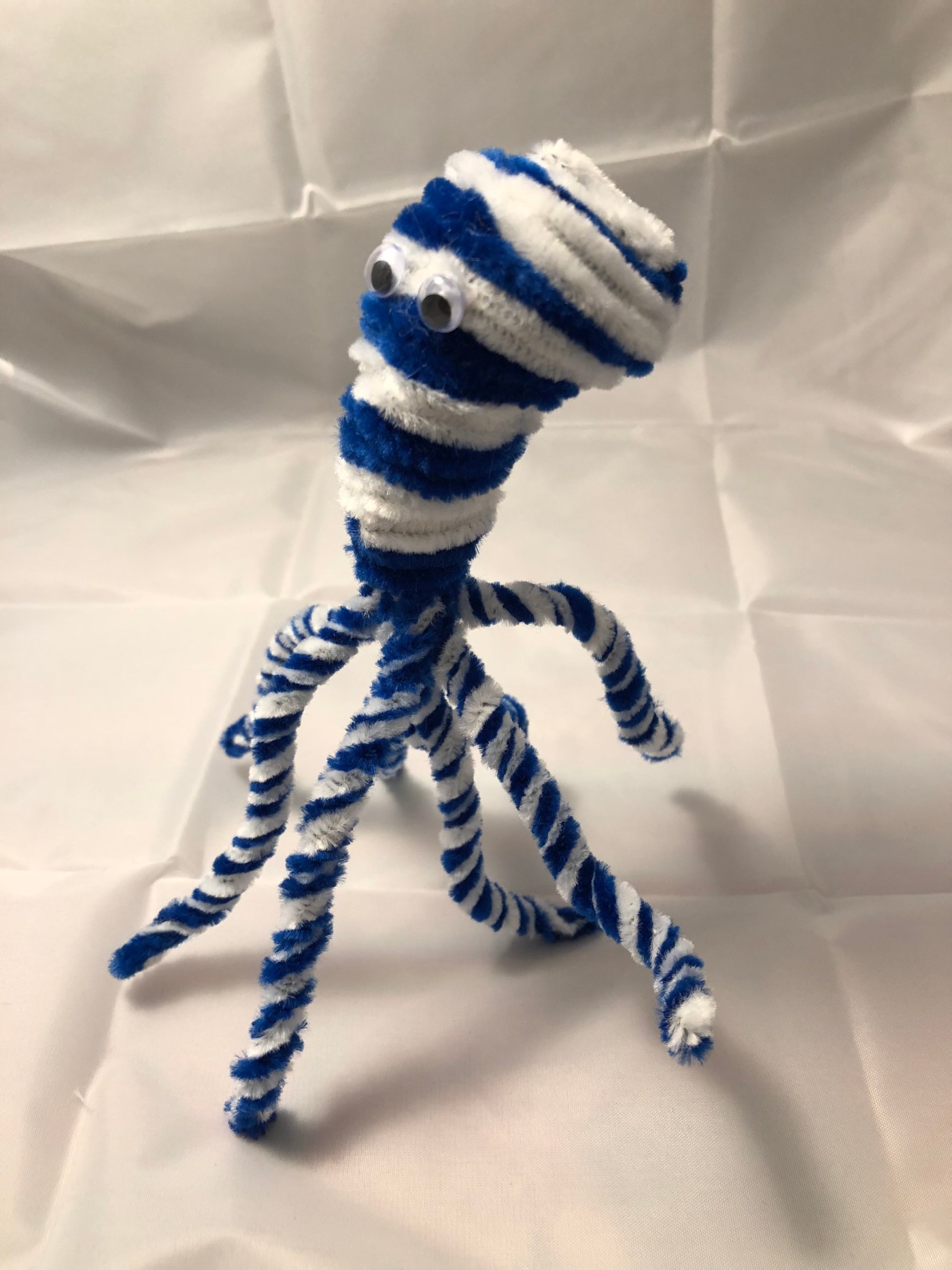 This little blue and white octopus can be made in under 1 hour. You will need roughly 14 white and 14 blue pipe cleaners (chenille stems) and a wire cutter is recommended, but optional.