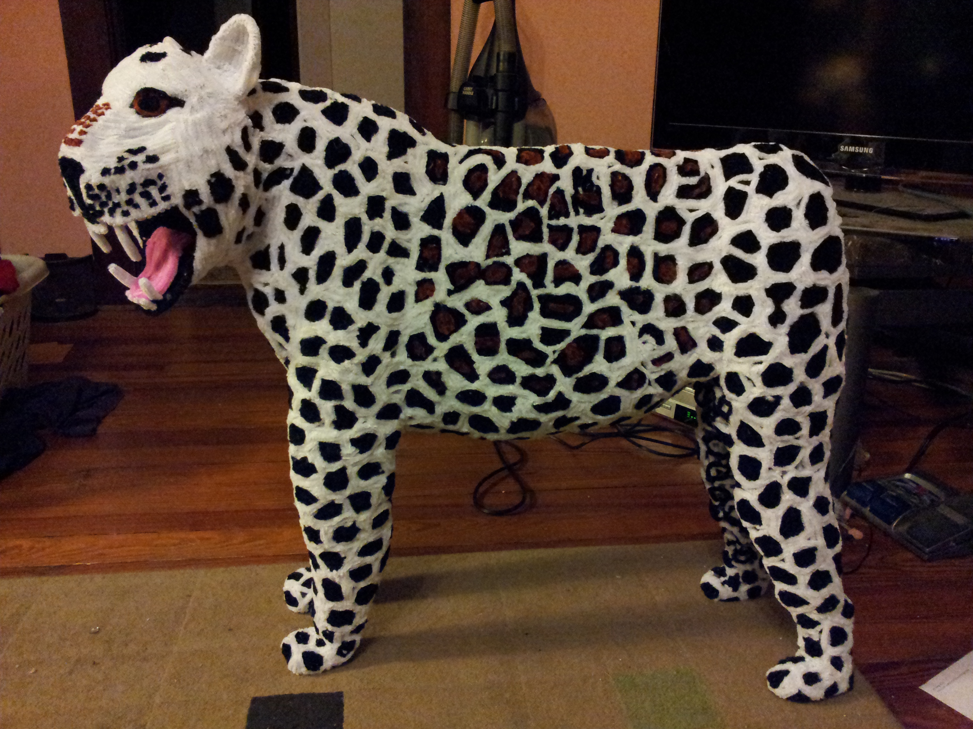 This pipe cleaner leopard (made of chenille stems or chenille sticks or pipe cleaners) is roughly two feet tall and three feet long. It is composed entirely of pipe cleaners and can stand on it’s own.